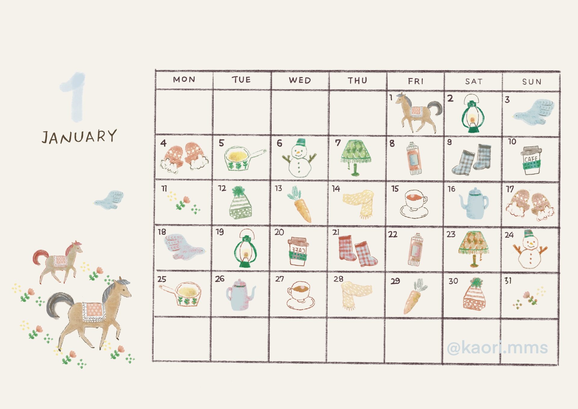 今回の日付シートは、冬の小物やモチーフを中心に、明るい色調でまとめました。